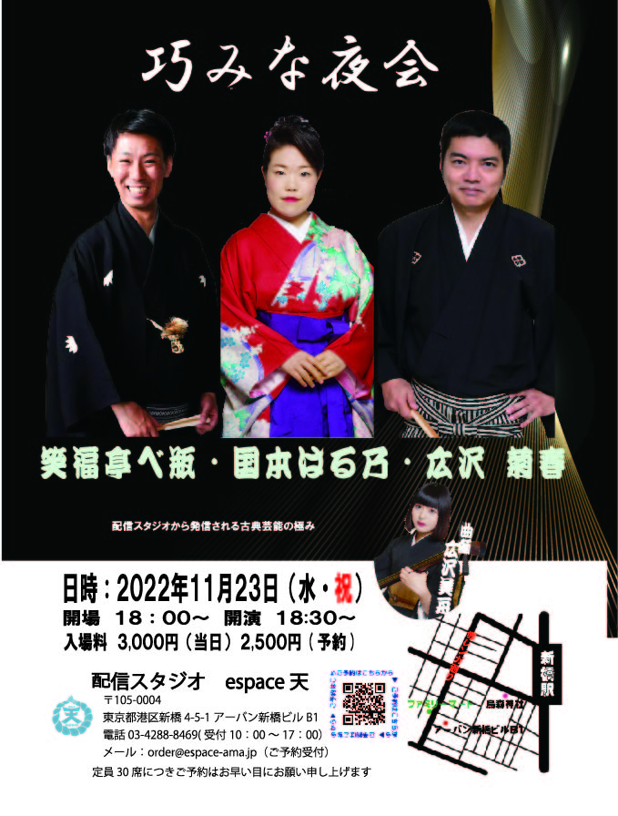 2022.11.23(水) 開場 18:00~ / 開演 18:30~ <入場料> ¥3,000 (当日) 2,500円(ご予約) 場所:espace天 【出演】 笑福亭べ瓶 国本はる乃 広沢菊春 イベント一覧ページへ