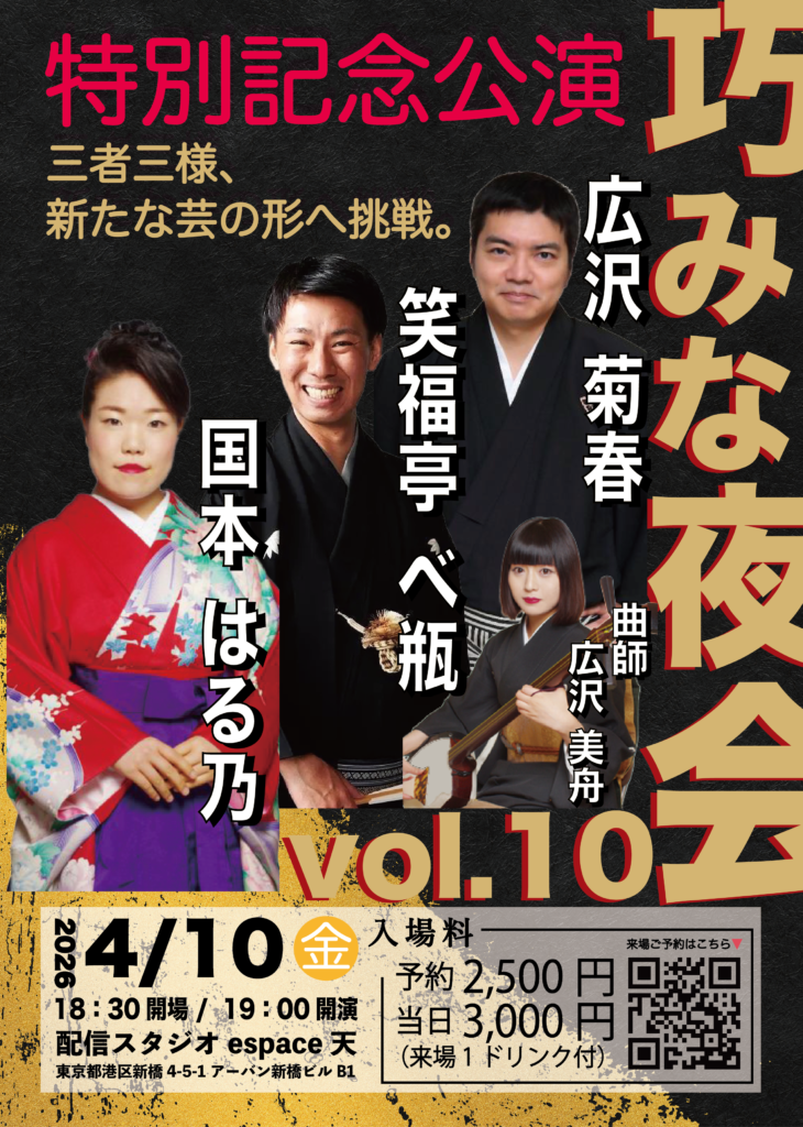 受付中 ※画像をクリックすると拡大した写真が見れます 巧みな夜会 vol.10 特別記念公演 - 開催概要 開催日時 2026年4月10日(金) 開場: 18:30 開演: 19:00 出演者 笑福亭 べ瓶 国本 はる乃 広沢 菊春 広沢 美舟 入場料 当日: 3,000円 ご予約: 2,500円 ※ 1ドリンク付き 会場 イースペース天 〒105-0004 東京都港区新橋4-5-1アーバン新橋ビルB1電話 03-4288-8469 アクセス方法を見る ご予約について Peatixで予約 備考 2026年4月20日(金) 巧みな夜会 vol.10 特別記念公演 三者三様、新たな芸の形へ挑戦 開場:18時30分 開演:19時00分 出演者 笑福亭 べ瓶・国本はる乃・広沢 菊春・広沢 美舟 会場 配信スタジオespace天 〒105-0004 東京都港区新橋4-5-1 アーバン新橋ビル B1 ← イベント一覧に戻る