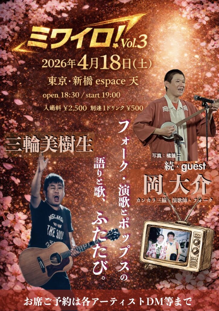 出演者:三輪美樹生 続guest:岡大介(カンカラ三線・演歌師・フォーク)